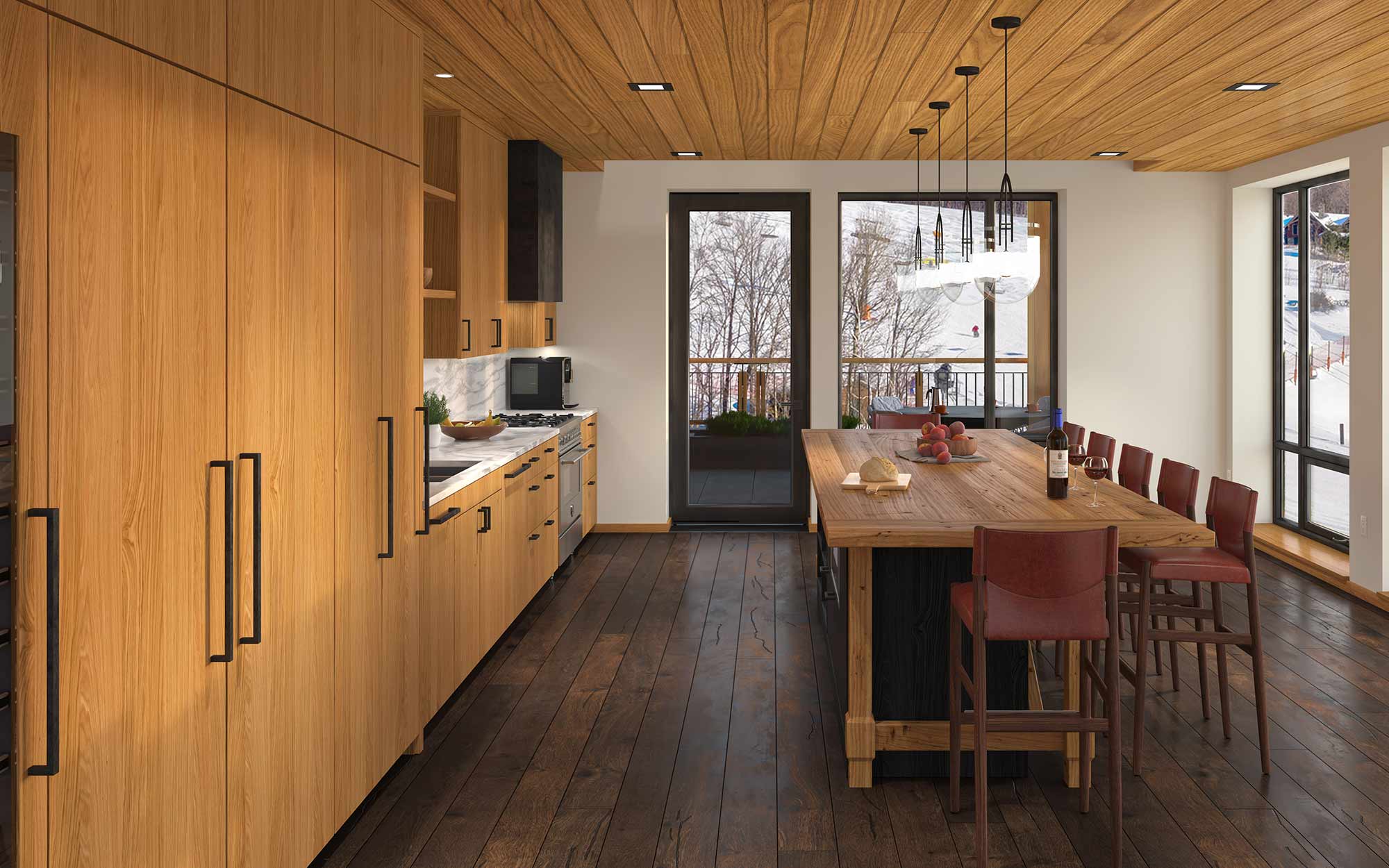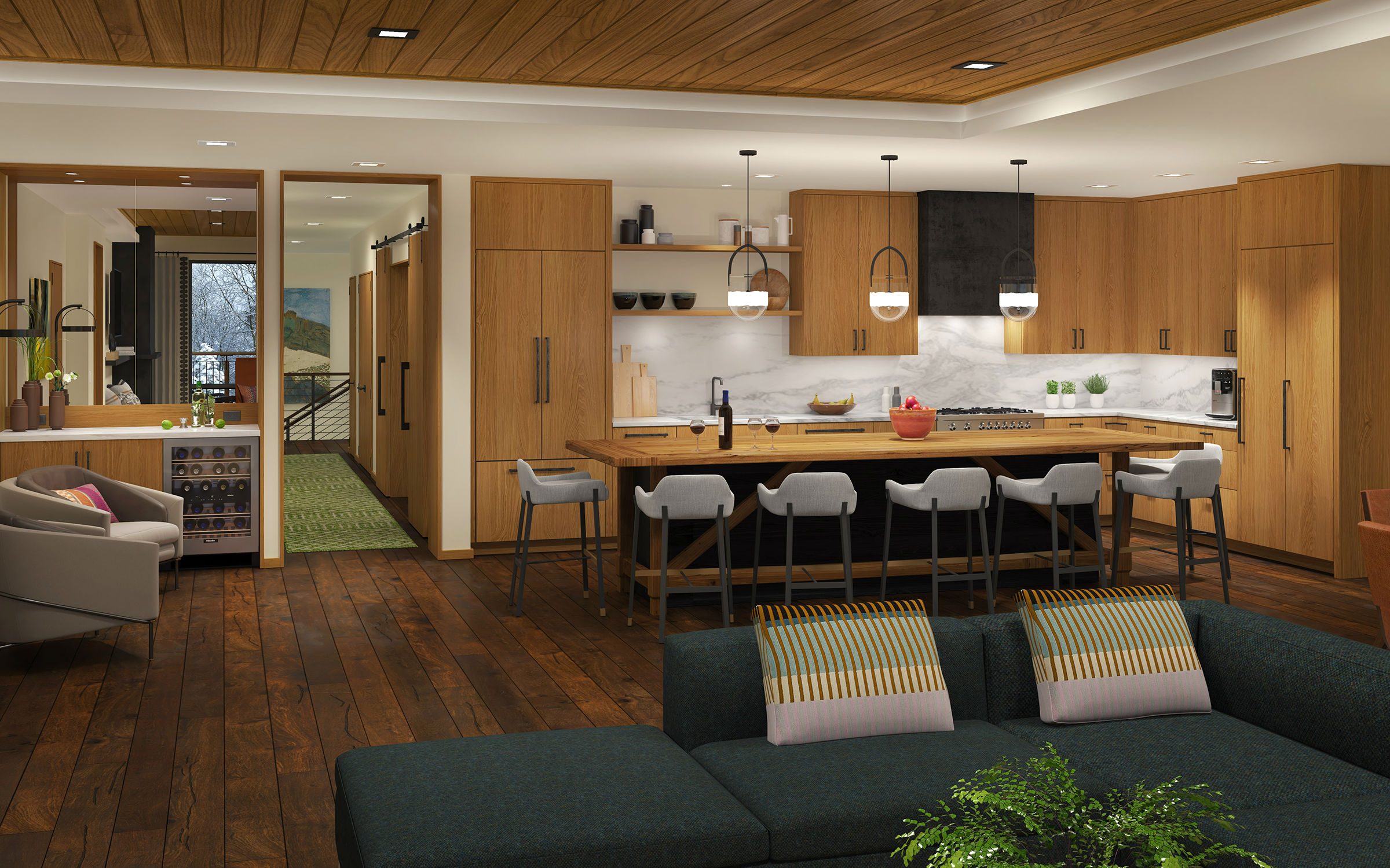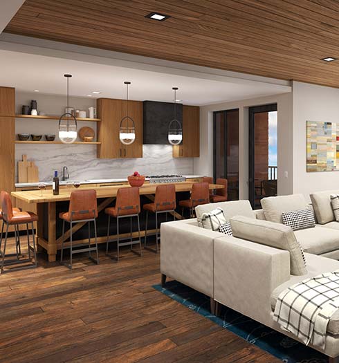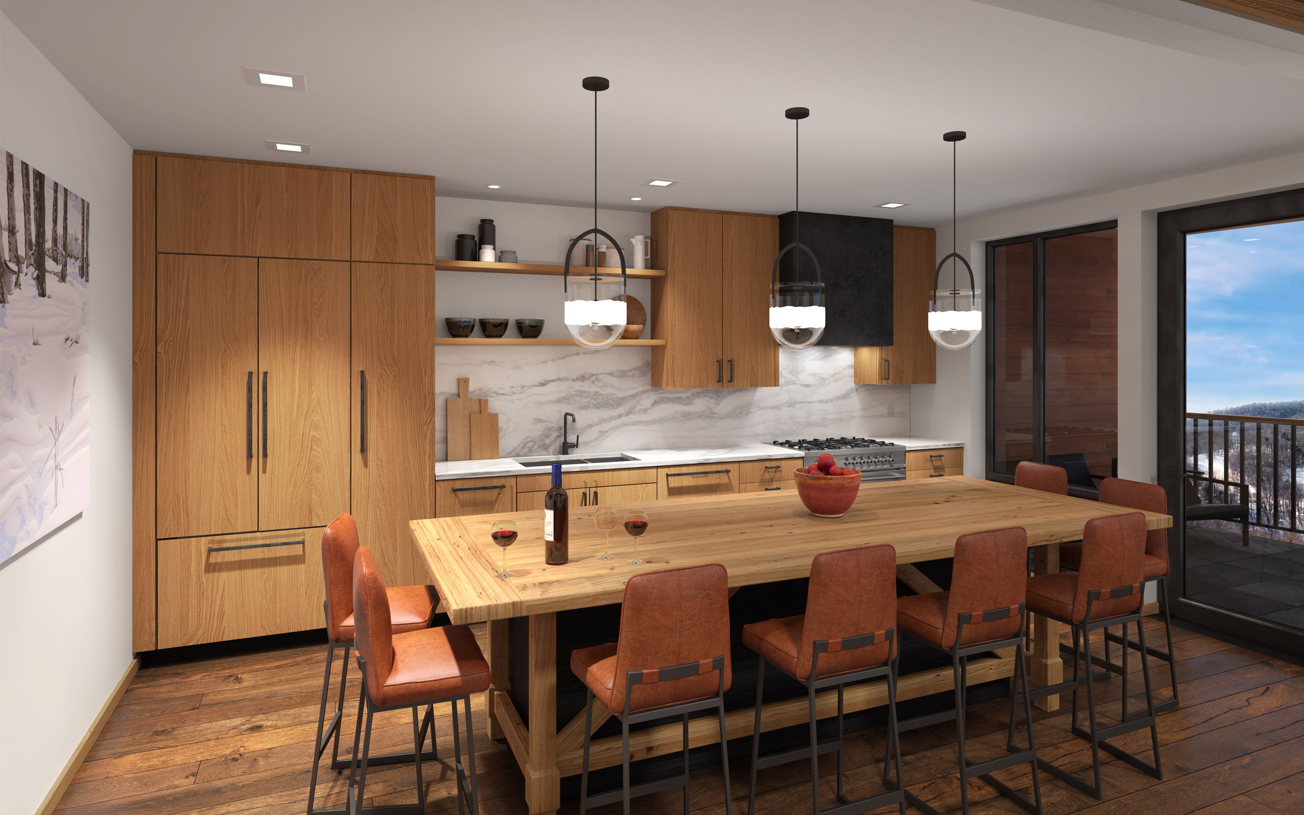 This thoughtfully designed retreat features floor-to-ceiling windows up to 20' high. Kitchens are designed to be the heart of the home, perfect for family dinners. The spacious outdoor terraces provide ample entertaining space, and the contemporary alpine design connects you directly with the mountain. One Spruce Peak also features locally sourced materials including honed marble countertops, farm tables and regional bluestone floors.