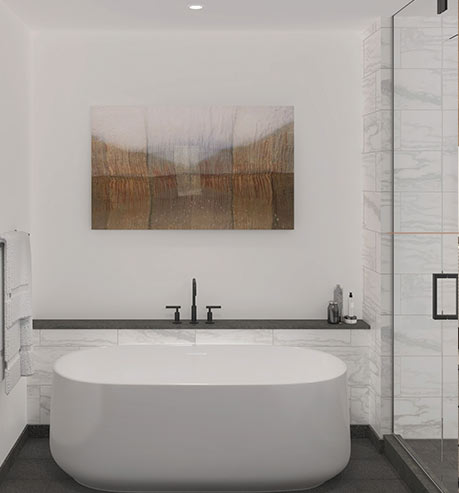 Master bathrooms offer marble counters and walls, a large soaking tub, Kohler plumbing fixtures and bluestone floors.