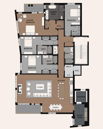 The bathrooms for each unit are oversized, modern, and highly elevated with deluxe marble counters, step-in showers, and top-of-the-line fixtures throughout.